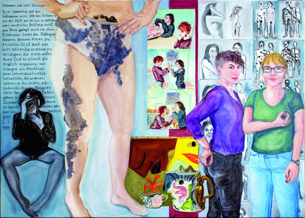 And on the very left side we quite prominently feature an abstract from Dabei sein und nicht Schweigen (To Bear Witness While Not Remaining Silent), a text written by Stötzer in 1979 in which she articulates the thought that one does not need to be forced to keep silent about one’s personal experiences in prison, as the drive to forget and move on is as strong as the lack of interest from one’s personal environment.