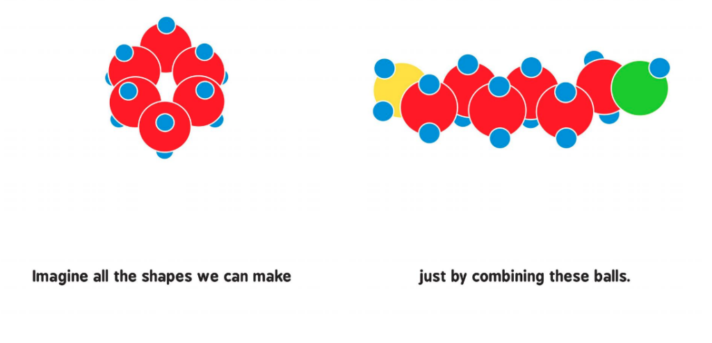 Chemistry has always been more accessible than physics to laymen, largely because of its colors and explosions and smells and relevance to everyday life; it “starts right in the heart of things”, as Oppenheimer put it. But even at an elemental level it seems easier because of the architectural nature of the subject – atoms which are the building blocks assemble into larger molecules. The basic idea to communicate was to think of atoms as balls that can attach to different numbers of other balls based on what element they represent – one for hydrogen, two for oxygen, three for nitrogen, four for carbon and so on. The combination of atoms into molecules then becomes a simple exercise — just count whether each atom attaches to its right number of neighbors. To make it friendlier, I asked my daughter to see if each atom has the right number of “friends” it holds hands with.
