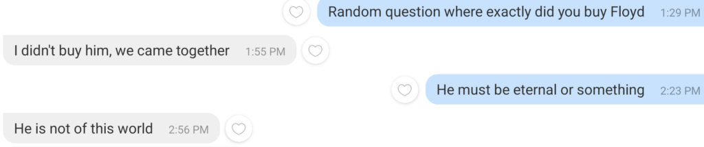 Before writing this, I reach out to my brother and ask him where exactly he found Floyd. It’s still a mystery to me, and I don’t buy the line about eBay. His response tells me everything I need to know.
