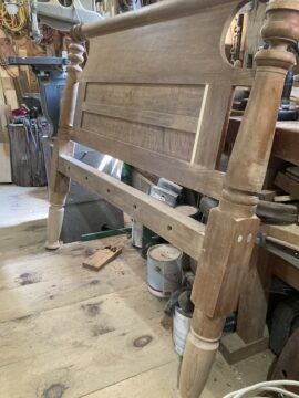 The bed and clock had probably been sitting in the woodshed attic until the 1930s when the neighbor needed them. And when he had sold the chicken farm to the drunk, the bed and clock stayed with the property. Since I’ve lived here that property has exchanged hands numerous times and the chicken farm has been wiped off the map. At least the bed is back home, with four newly-turned corner post legs. This story has a jarring ending: While in his shop turning one of the replacement corner post legs, the maple block came free of the lathe and bonked Don on the forehead, requiring a trip to the emergency room and several stitches.