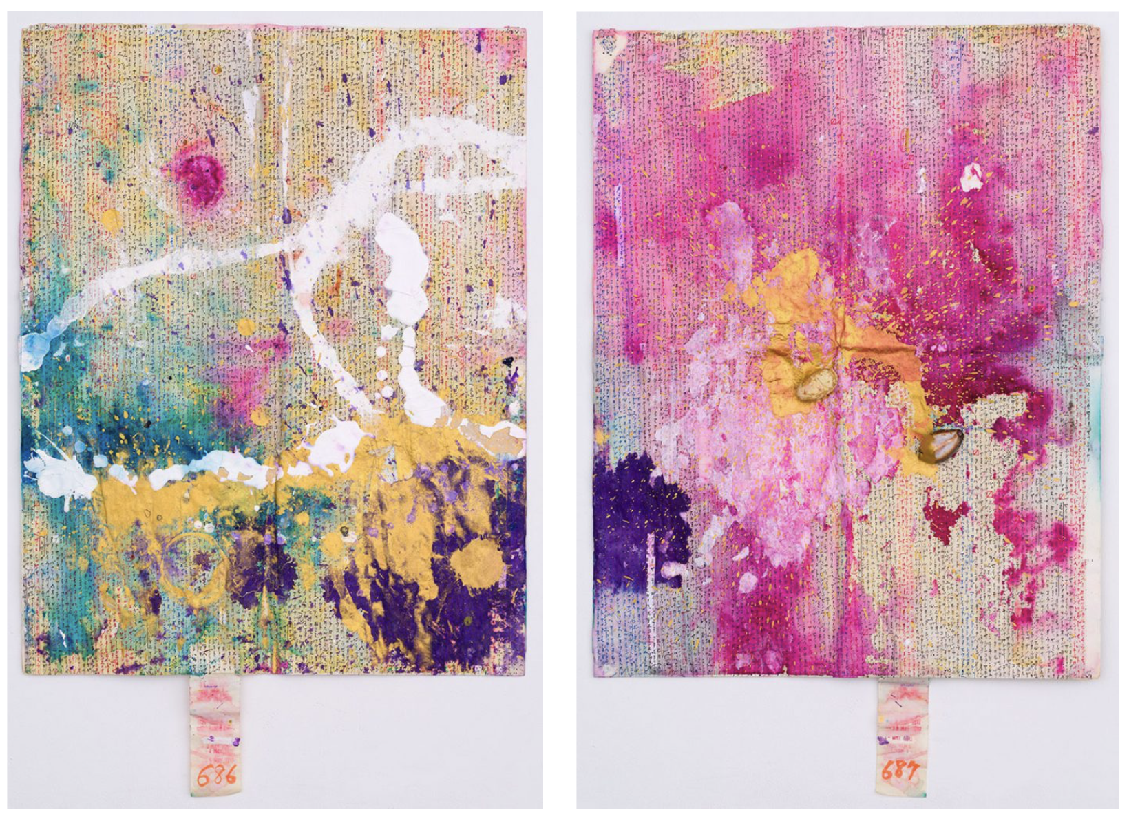 The series as a whole includes manuscripts on which are extensive enumerations of letters and words repeatedly dismantled and rearranged in response to the voices and shadows of the deceased, recovered by painted color layers. This series appropriates tragedy through the act of interfering with and destroying the process of language production, while creating existential dreamscapes offering new flux or a peculiar prayer.”