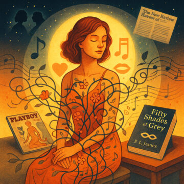 A softly surreal, collage-like image showing a woman seated in calm, luminous contemplation, her body subtly dissolving into a radiant tangle of flowering vines, abstract ropes, and musical notes. Her expression is serene and open—not eroticized, but embodied, grounded, present. Behind her is a soft glow resembling a mandala of four overlapping symbols: a heart, a musical note, an infinity symbol, and an open mouth—representing pleasure, music, transformation, and speech. Surrounding the scene are symbolic echoes of the article’s arc:
