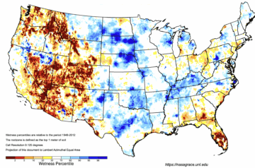 Where I live, my observations of our empty and half empty ranch ponds, concur with NASA’s satellite observations—the root-zone soil and the shallow ground water zones are near historic lows when it comes to moisture.