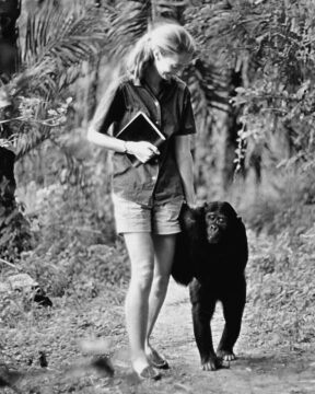 …As the apes lost their wariness of her, Goodall was able to sit for hours, patiently observing their behaviour and their hitherto unrecognised complex social system. She discovered that the chimpanzees were not in fact vegetarian as previously thought, but omnivorous, and would communicate with each other to hunt for meat. She was able to witness the closeness of their family bonds and how each animal’s individuality would influence their behaviour.