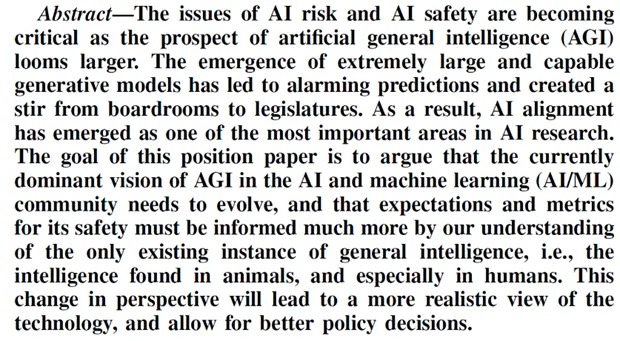 The main point made in the paper is that, to be meaningful, general intelligence should refer to the kind of intelligence seen in biological agents, and AGI should be given a corresponding meaning in artificial ones. Importantly, any general intelligence must have three attributes – autonomy, self-motivation, and continuous learning – that make it inherently uncertain and uncontrollable. As such, it is no more possible to perfectly align an AI agent with human preferences than it is to align the preferences of individual humans with each other. The best that can be achieved is bounded alignment, defined as demonstrating behavior that is almost always acceptable – though not necessarily agreeable – for almost everyone who encounters the AI agent, which is the degree of alignment we expect from human peers, and which is typically developed through consent and socialization rather than coercion. A crucial point is that, while alignment may refer in the abstract to values and objectives, it can only be validated in terms of behavior, which is the only observable.