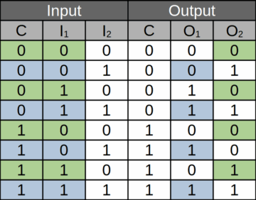Truth table of the Fredkin gate. Green highlight corresponds to the action of the logical AND, blue implements the OR-operation.