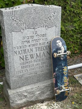 And when Tashi propped up against Teddy’s gravestone the skateboard she had carried with her from her home in BC, a skateboard her partner had had adorned for her with the Marie Cosindas image of her father, I was reminded of the antique funerary rituals of the various Proto-Indo-European tribes, their habit of burying artifacts with their honored dead to accompany them into the beyond. And I was glad that I could finally be at the cemetery that day, in my own capacity as father and uncle, celebrating a prehistoric rite made new by our peculiarly modern presence.3