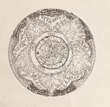 Despite his unhappiness, however, in the 1960s and 70s Teddy’s mixture of DIY, art-school chops, neo-romantic sex appeal, and drug-induced rejection of the establishment rendered him a perfect creature of the zeitgeist. He produced marvelously intricate pen-and-ink mandalas and caricatures reminiscent of John Lennon, and distorted language with exhilarating freedom and idiosyncratic whimsy (which is in part why I used a photograph of him in a recent post on linguistic development). I benefited, in early adolescence, from my uncle’s maverick dietary counsel—avoid salt, don’t drink anything to accompany your meals, lest it wash away beneficent gastric acids—derived from the faddish company he kept, and inherited all of the navy-blue items in his wardrobe when he decided to dress exclusively in tones of red and orange to enjoy their more salutary chromatic vibrations. (Come to think of it, Teddy may have thus preceded Joe Strummer as my ideological fashion arbiter.) My uncle was also always good for a zany, ribald bon mot. To this day my brother half winces, half beams at the sobriquet Teddy bestowed on him when, perhaps five or six years old, Adam interrupted a conversation among adults to demand a new plastic action figure (likely a Big Jim rather than a GI Joe) and Teddy dubbed the impetuous, appetitive little boy Buy Me Sex Muscle.