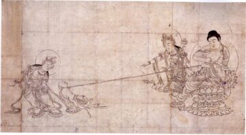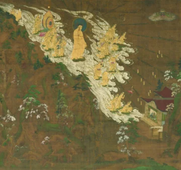 Around the time Tōhaku was painting his pines, Japanese aristocrats also were gazing at certain pictures as they lie on their deathbeds. Like Philip II of Spain. Imagining heaven as a beautiful blue-green landscape, covered in hills and mist-covered valleys, polychrome ink paintings often situated a lonely hut amidst the lush scenery. In such a setting, it was believed that Amida would descend on purple clouds from paradise to meet the faithful. As long as the believer chanted Amida’s name faithfully, the Buddha of Light would come to escort them back to the land of bliss. Called raigo-zu, these paintings of “Amida’s Welcoming Descent.”