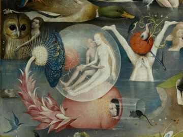 Standing before Bosch’s Garden of Earthly Delights in the Prado is an act of surrender. Eyes are consumed by details: naked bodies cavorting in crystalline ponds, human-sized strawberries and a multitude of dripping cherries. There are birds devouring humans, whilst cities are collapsing into flames at the far edge of vision. Each figure is rendered with miniature precision, yet together they overwhelm, producing an excess that resists containment.