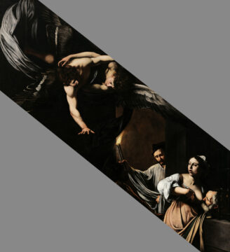 Traditionally, the chiaroscuro in the painting—the stark orchestration of light so emblematic of Caravaggio’s revolutionary style—has been interpreted as the expression of God’s will shining down on humanity and imbuing it with divine mercy. The angel’s pose is based on Michelangelo’s fresco The Conversion of St. Paul in the Vatican’s Capella Paolina, in which Christ, appearing in the heavens, extends his hand down to Earth to give manifestation to His divine power.