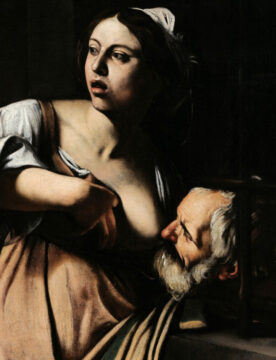 The woman is in no need of divine inspiration; aware of the danger and potential repercussions of her deed, her expression is both apprehensive and defiant. The decision is entirely hers. All the diagonals and all of the painting’s sweeping movement—from the arm of the angel and the two candles in the hand of the priest to her left to the curve of his draped tunic; from the lighting on the skin of the naked figure and the nobleman’s upper thigh to the folds in the young mother’s dress—converge at her breast: she is the compositional center, the painting’s locus, the primary act. Caravaggio’s is a subversive vision: in the end, it is humanity’s own capacity for spontaneous compassion that will save it, a capacity that Caravaggio in all likelihood witnessed on the cruel and squalid streets of Naples, with their unexpected moments of mercy and grace.