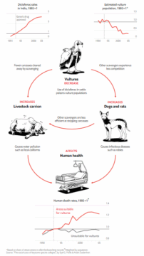 Diclofenac is a veterinary drug used in India. Even minimal residues of diclofenac overwhelm vultures’ physiology, which lacks the renal capacity to metabolize the drug. When treated cows die, their carcasses become a death trap for unsuspecting vultures. Diclofenac use in India caused vulture population declines by up to 90%, with downstream consequences for disease management and human health.