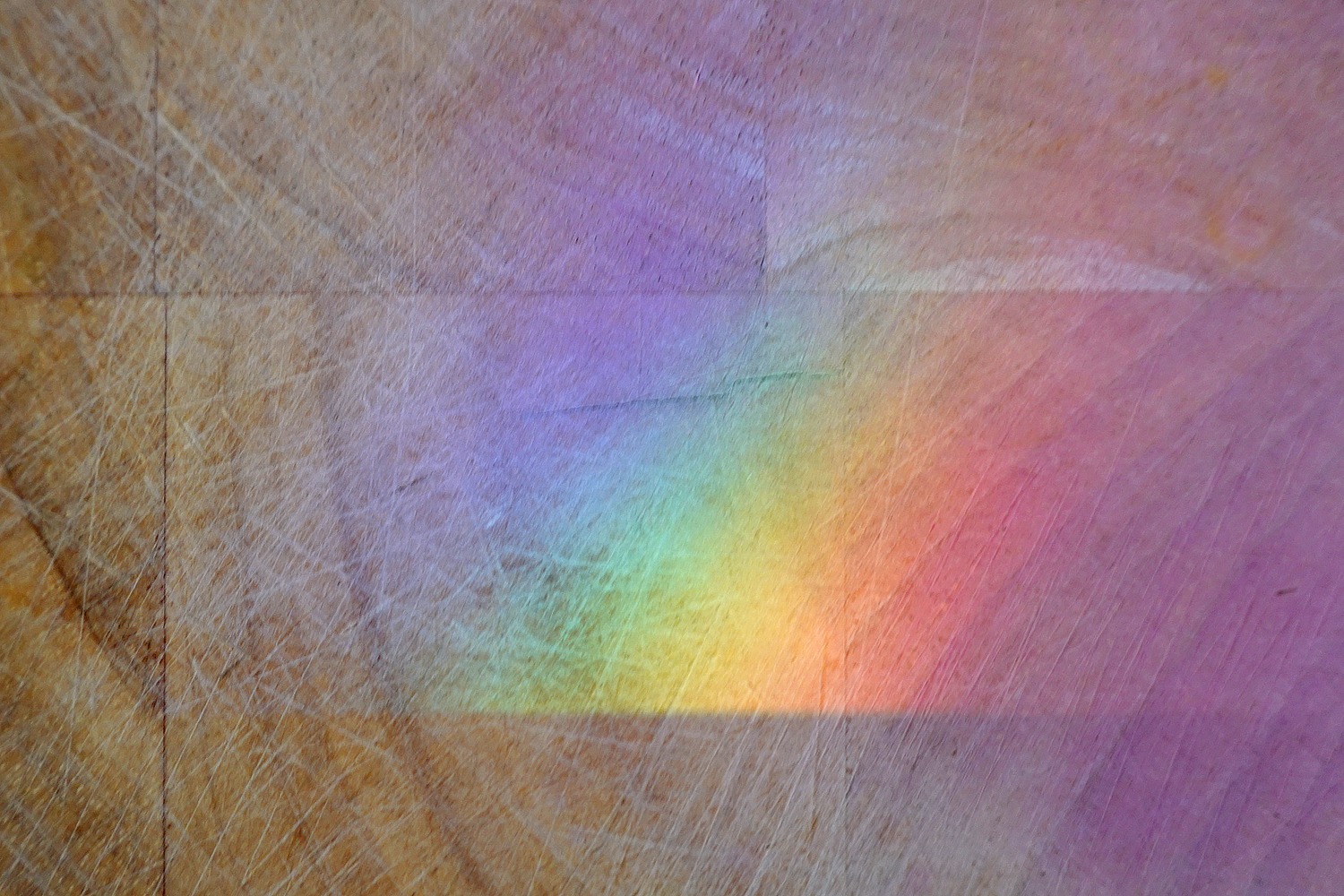 A glass ashtray turned the weak winter sunlight from the window into this rainbow on a wooden cutting board on our kitchen counter.