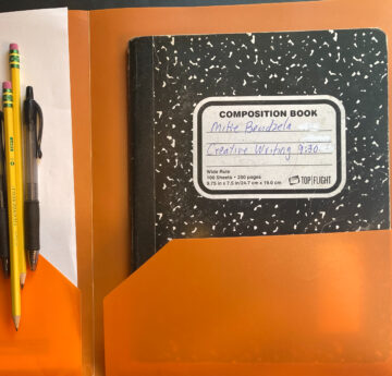 As the photograph of the notebook accompanying this article illustrates, I participate in assignments along with students. The four modules of the class are Verse, The Tale, Memoir, and The Writer’s Notebook. The notebook has always been required in my creative writing classes, but over the last year it has begun to bear more of the weight of the final grade: This past fall semester the notebook counted for 40% of the grade, up from 25% the semester before. This spring semester it will count for 50% of the grade.
