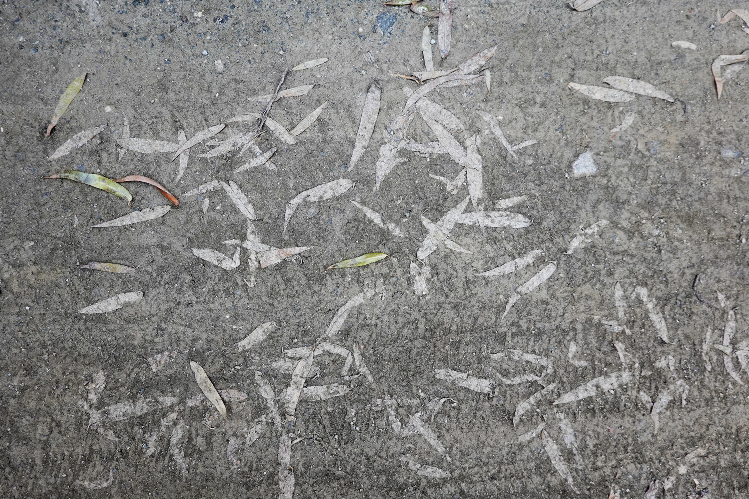 Leaves pressed into a dirt road by passing vehicles and/or people in Franzensfeste, South Tyrol.