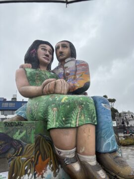 Five or six times life-size (about ten meters high) the two figures, built to honor the 150th anniversary of the city, were inspired by a classic 60s song by Los Iracundos, a band from Urugay, called “Sentados Frente al Mar,” “seated in front of the sea,” which they are.