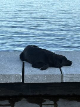 A little too house-trained, she refused the grim wee-wee pads in the living room. When I lifted her up by the double harness that the hospital had provided in order to take her outside, she yelped in pain, reaching with her snout to bite me except I (aging a bit more slowly) would be too quick for her, carrying her sixty pounds (twenty less than when she had been well) down our front steps so she could shit and pee.