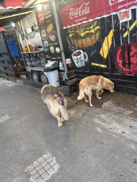 In Morro de Sao Paolo, an island off the coast of Bahia in Brazil, a medium-sized white dog with black spots abandoned her puppies to follow Angela and me for hours, digging deep in the sand while we sat on the beach, accompanying us into town when we went off to eat, then suddenly and unceremoniously abandoning us. What is that street dog instinct, not begging, not threatening, just accompanying? Another canine category: dogs that follow.
