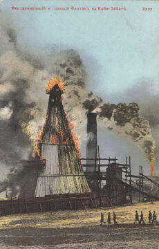 By the late 1800s, large oil fields were discovered offshore. Baku by then was producing over half of the world’s demand. But the labor became incredibly dangerous, and oil gushes were common. High-pressure blowouts would spew oil, mud, and gas into the air, and sometimes even ignite. Azerbaijan was known as the “Land of Fire” as these infernos billowed black plumes into the sky.