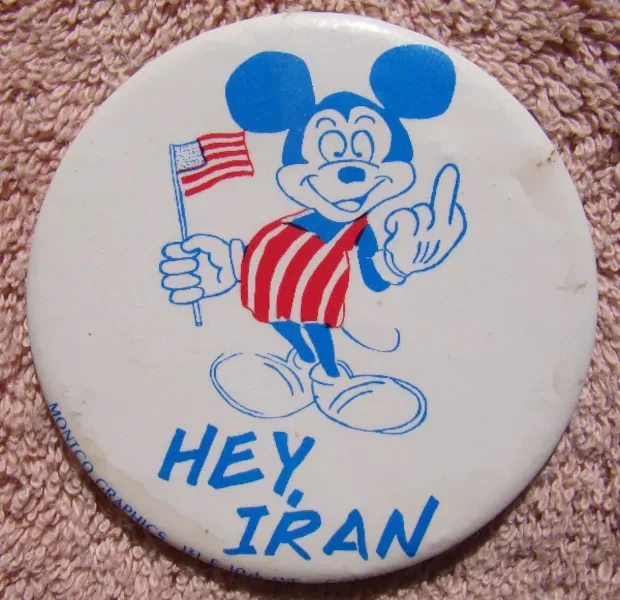 I was 12 years old when I walked down a street in my Bronx neighborhood and saw the poster in the window of Cappie’s. Cappie’s was a certain kind of corner store common in 20th century New York. It sold newspapers and magazines, candy and soda, lotto tickets, cigarettes, and various tchotchkes aimed at kids and teens. Cheap toys, baseball cards, posters, etc. Most of their posters were pinups of the era’s sex pots such as this or that Charlie’s Angels in various states of near nudity. But this poster featured a cartoon mouse, a clear copyright infringement on Walt Disney’s famed vermin. The caption read: Hey, Iran! The mouse held an American flag in one hand. The other flipped the bird.