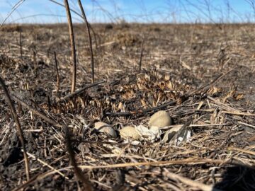 Old eggs and nest of Eastern Meadowlark against clump of Big Bluestem Grass in a Central Illinois prairie remnant