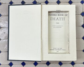 I’ve followed his advice—or rather, taken advantage of his humorous waiver—and managed a book of poetry of my own; and books have certainly played as important a role in my life as they played in his. Indeed, when I returned to Switzerland from Canada last year, sad that airline regulations forbade me to transport “human remains” with me on the plane, and thus had deprived of an urn of my own, my brother sent me some of our father’s ashes for safekeeping at my home abroad—in a copy of The Oxford Book of Death, specially hollowed-out, secret-agent/treasure-map style. As if my deceased father, a fan of Eric Ambler, Ian Fleming, and Graham Greene, were still recommending racy reading material from beyond the tomb.