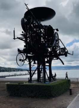 “Heureka” (1964), installed on the Zürihorn as a public artwork in 1967 and stirred automatically into action thrice daily for eight minutes at a time between April and October, suggested itself as an appropriate site for a couple of reasons: My father had enjoyed the Rube-Goldberg-like assemblage on visits to Zurich years ago, the absurdist poetry of its industrial machinery cranked up into a Chaplinesque ballet sequence; and a local artist friend of mine stages a musico-mystical event there every year on the anniversary of the sculptor’s death in 1991, which occurred in the month of August, like my Papa’s. So “Heureka” had already been marked for me as a site of remembrance.