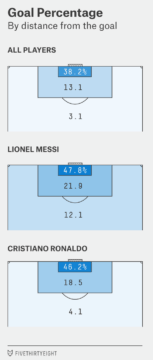 [i] Do note, though, that Messi scores ‘almost as often per shot from outside the penalty area (12.1 percent) as most players do inside it (13.1 percent)’, as the FiveThirtyEight article puts it, an incredible datum in itself. He is also by far the best at goal efficiency given his volume of shots, which is very high indeed, and this is also quite impressive.