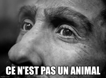 Rene Magritte’s paradoxical “The Treachery of Images” serves as the inspiration for the meme, which goes beyond the artist’s joke about the representation of objects to show simply that this particular image, a photograph of a model of an extinct human, depicts what most people still deny–an animal, full stop.