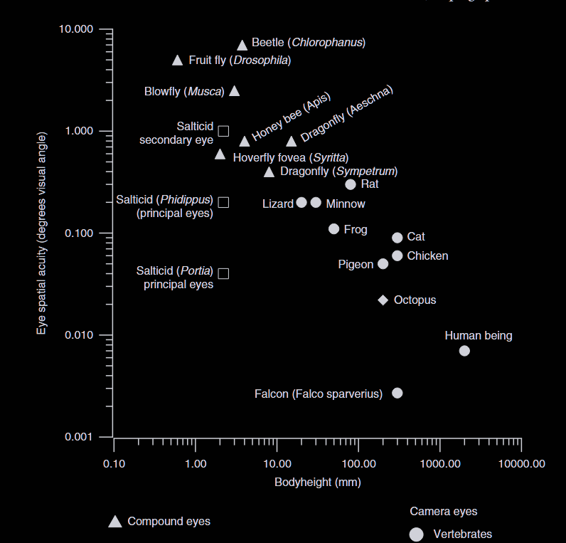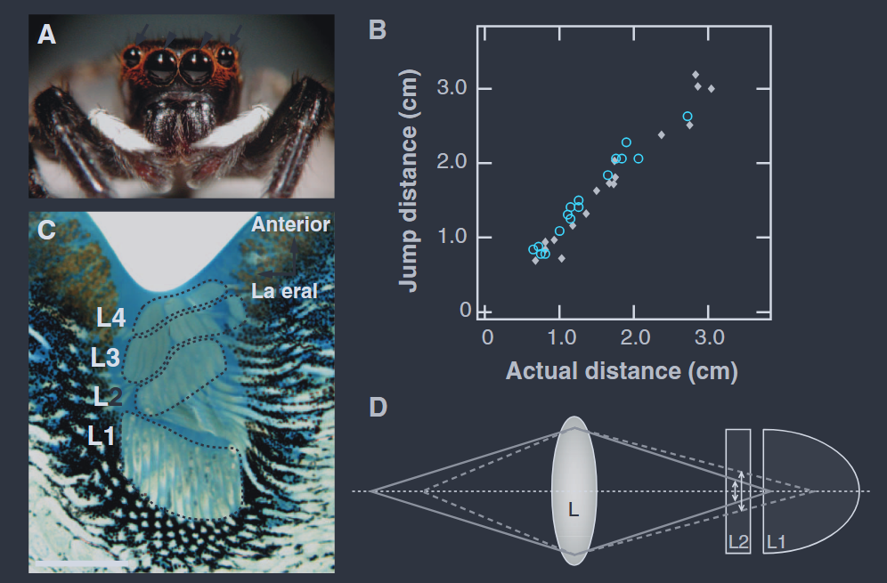 The true marvel of vision resides in their two principal eyes. Across animals, visual acuity scales strongly with eye size. Falcons are exceptional among vertebrates, but relative to its size, a jumping spider’s visual acuity is even more extraordinary. There are three aspects of their unique vision.