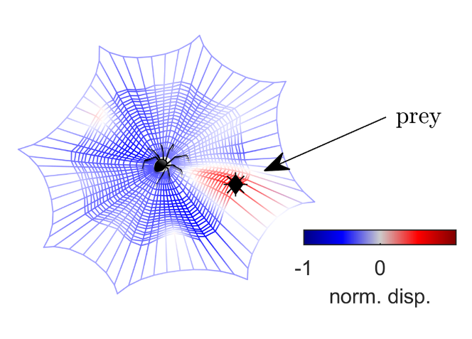 Spiders localize prey by comparing vibration patterns across their eight legs, which function as spatially distributed sensors. By analyzing differences in radial and transverse vibrations, the spider can estimate both the direction and distance of the source. Direction is inferred from the leg experiencing the greatest radial tension in the silk. Transverse vibrations, measured by comparing displacements across legs positioned at roughly 90° to each other, provide distance cues. Like a taut fabric pressed at one point, the deformation is steep and uneven nearby but shallow and uniform at a distance. The closer the prey, the sharper these cross-leg differences become.