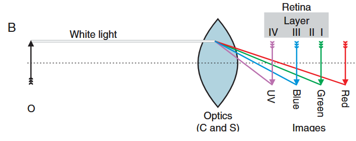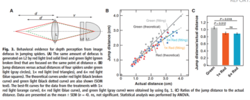 The second is chromatic aberration. Lenses focus different wavelengths of light at slightly different distances. In large eyes, this difference is negligible, but in the tiny eyes of jumping spiders, it can introduce significant blur.