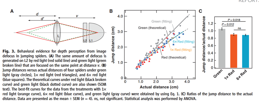 Under red illumination, spiders consistently underestimated distance and jumped short, even when red intensity was increased sixfold beyond this matching level, ruling out brightness as an explanation. These results confirm that jumping spiders infer distance from image defocus caused by chromatic aberration.
