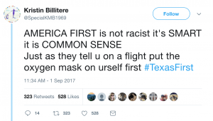 “As a parent, the first time you hear the flight attendants tell you to put your emergency oxygen mask on before your children’s; you’re probably a little horrified. We’d all die for our kids—so how can we selfishly take care of ourselves before we attend to them? The answer is, because if you’re dead, you can’t take care of anyone, and conversely, if you can breathe, you can help everyone around you. We must put America first.” Committed Conservative, “America First: Let’s Secure Our Own Oxygen Mask” (Mar. 2, 2017)