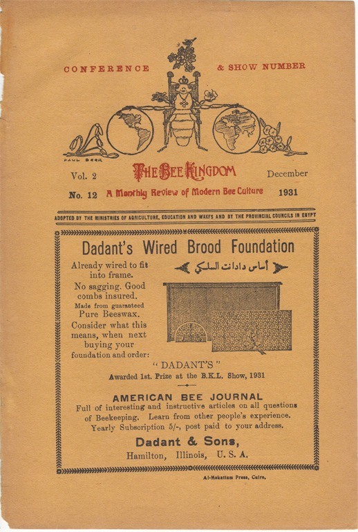 He returned to Cairo in 1922, and by 1930 he had launched another bee husbandry group, the Bee Kingdom League, and a bilingual Arabic-English bee journal, The Bee Kingdom, which he edited and published for eight years. He kept a large apiary in the Delta, in Khorshed, and honey sales provided him with a supplementary income. By the mid-thirties, his bee enterprises had attracted attention, and he was invited to establish King Farouk’s royal apiaries.