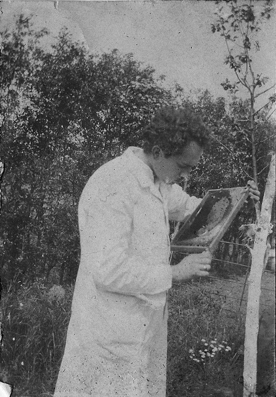J.G.: I’m not sure what led him to study bees, or exactly when he became interested in them. Several 1917 photographs show him sitting with a beehive in the garden behind his house in Ealing. These photos are the earliest evidence I have of his involvement with beekeeping.