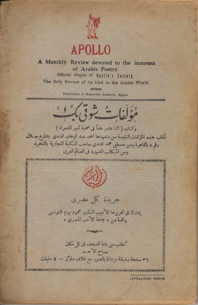 J.G.: Abushady was an influential figure at a time when Arabic poetry was going through a radical shift, and in addition to being a prolific poet and translator, he was an editor and publisher. Apollo allowed him to provide a platform for young writers and experimenters to publish their work alongside luminaries of Arabic poetry. He gave local artists exposure as well—cartoonists, calligraphers, painters, illustrators—Apollo was unique for its copious illustrations.