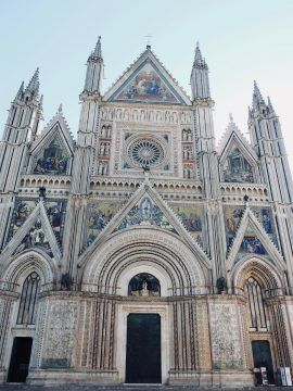 The heart of Orvieto has always been the cathedral. Surprisingly grand for such a small town, it is built of alternating stripes of black and white marble in the Sienese style. Work was begun in the late 13th century to house an important relic. And no cost was too great in its construction. From the dazzling mosaics that adorn the façade to the many works of sculpture both on the exterior and interior of the cathedral, some of the greatest names of early Renaissance Tuscan art had a hand in its decoration.