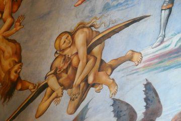 A particularly famous detail from this fresco is of a young woman being borne on the back of a horned demon in flight. She is completely naked and looking back in horror from the place where the angels of God guard the gates of heaven so no sinners can enter. With her long blonde hair, one of the guides–an old timer it seemed– suggested that Signorelli had painted the likeness one of his previous mistresses in this role as female captive. The leering demon resembled a butcher hauling an animal back to his lair to be skinned and eaten.