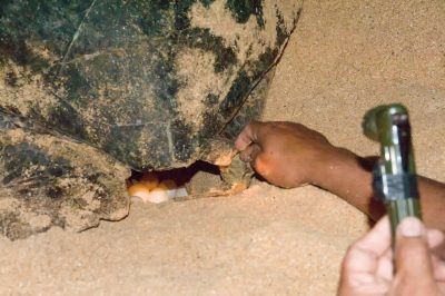 A turtle will nest as many as ten times at intervals of 10-17 days. Once she has dug a large pit with all of her flippers the turtle digs a chamber with her hind flippers into which she lays around 120 ping-pong sized eggs.